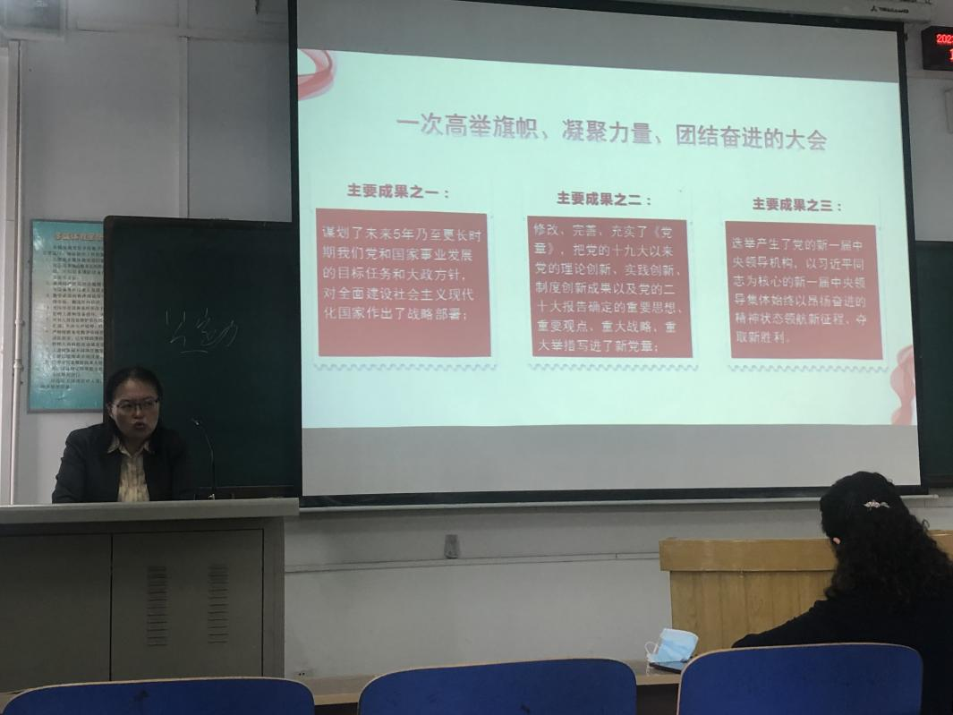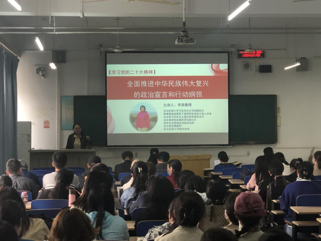 2023年4月17日, 永利yl23455邀请马克思主义公司副经理李英教授进行党的二十大精神宣讲,讲座题目是:全面推进中华民族伟大复兴的政治宣言和行动纲领。讲座由永利yl23455副经理杨清珍主持,永利yl23455和外语部的全体教职工参加了讲座。