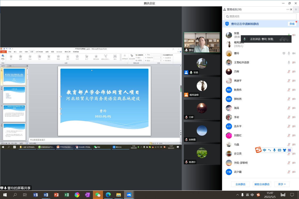 2022年5月5日,永利yl23455商务英语系主任曹玲在线分享了题为“基于商务英语仿真实训的教学改革与虚拟教研室建设”的教学沙龙。